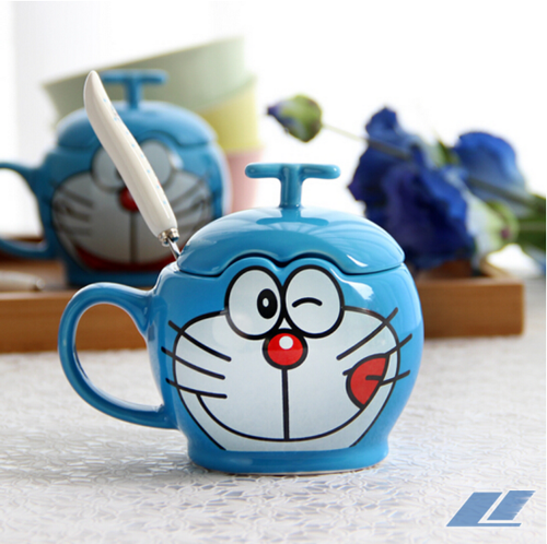 哆啦a梦叮当猫创意马克杯陶瓷水杯卡通杯子咖啡杯子情侣杯带盖勺 D款微笑送勺带盖